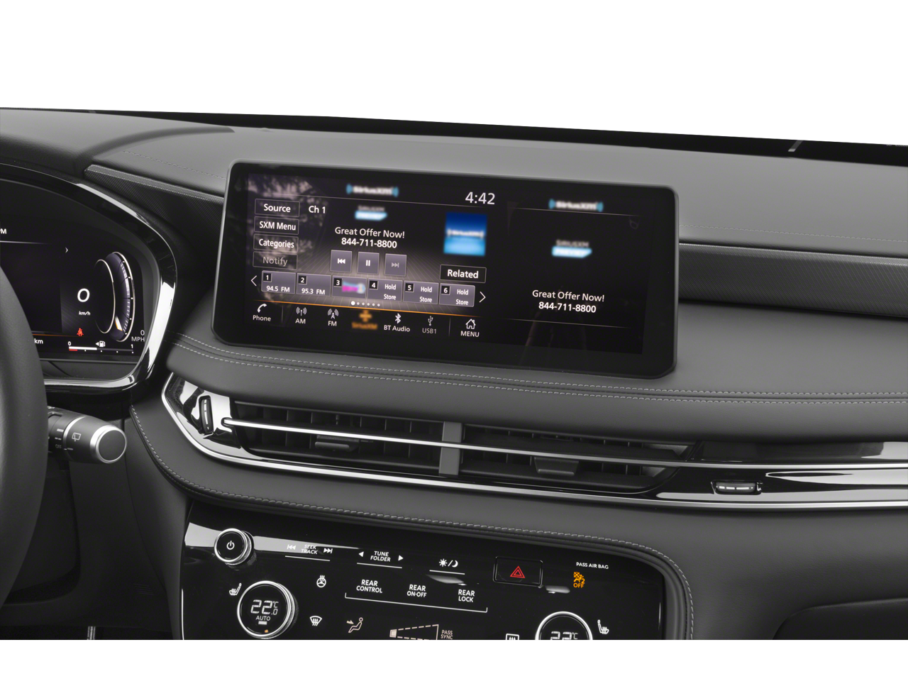 - Radio: Bose Performance Series -inc: 17 speakers, INFINITI InTouch 12.3" interactive display w/navigation (includes mapcare and premium traffic), INFINITI InTouch w/wireless Apple CarPlay integration and Android Auto (includes Bluetooth®), HD Radio technology, SiriusXM radio, WiFi hotspot, INFINITI voice recognition w/Siri Eyes Free/Google Assistant, INFINITI InTouch services, Active Noise Cancellation (ANC), Bluetooth® hands-free phone/voice control switches, data capable type-A and type C USB connection ports and steering wheel audio controls